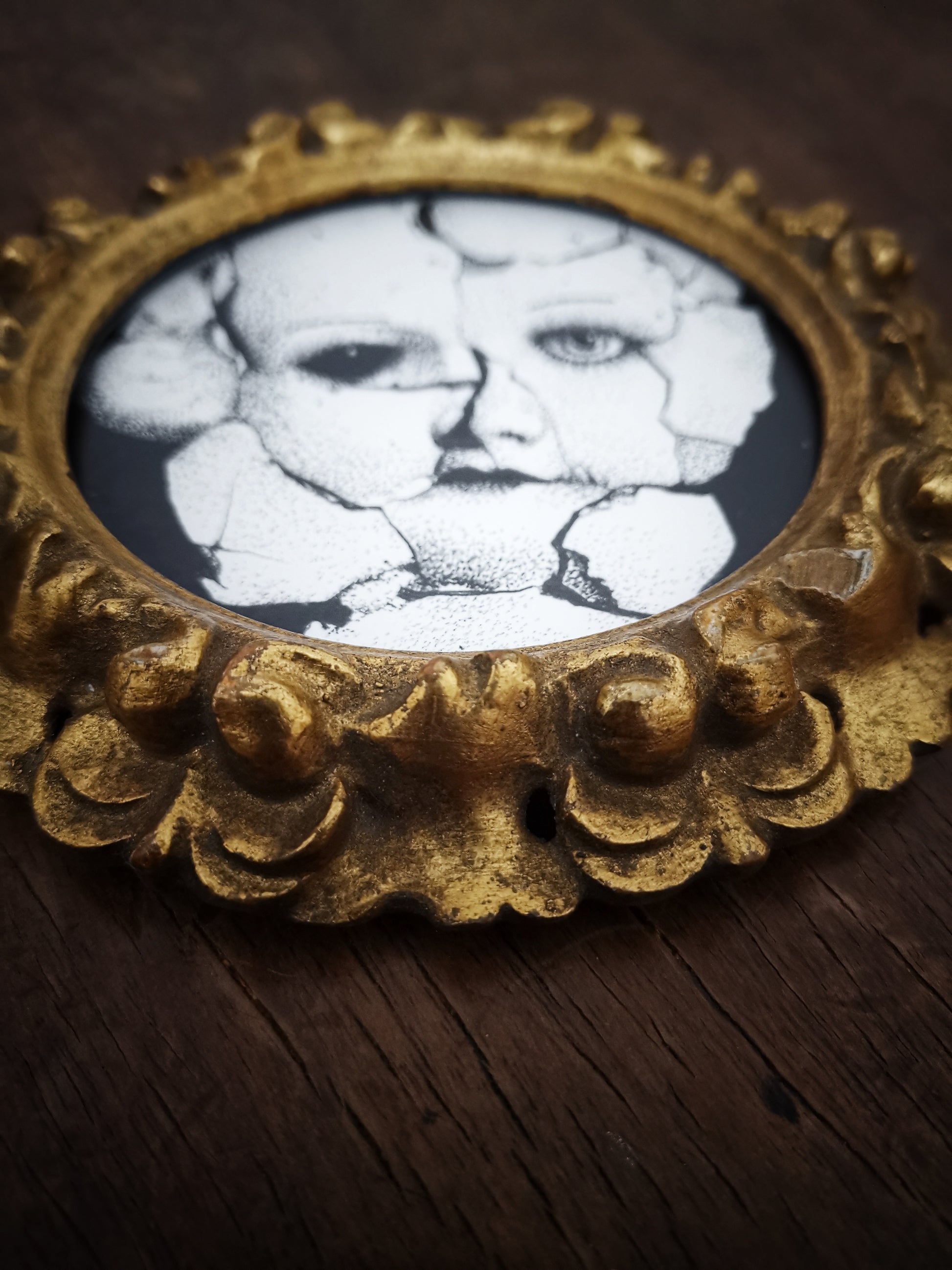 Housed in a beautiful small antique, carved, wooden, gilded frame. Italian early 1900.