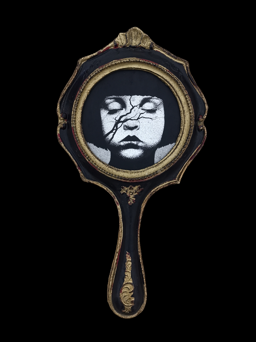 Housed in a beautiful Florentine wooden gilt and enamel hand mirror.