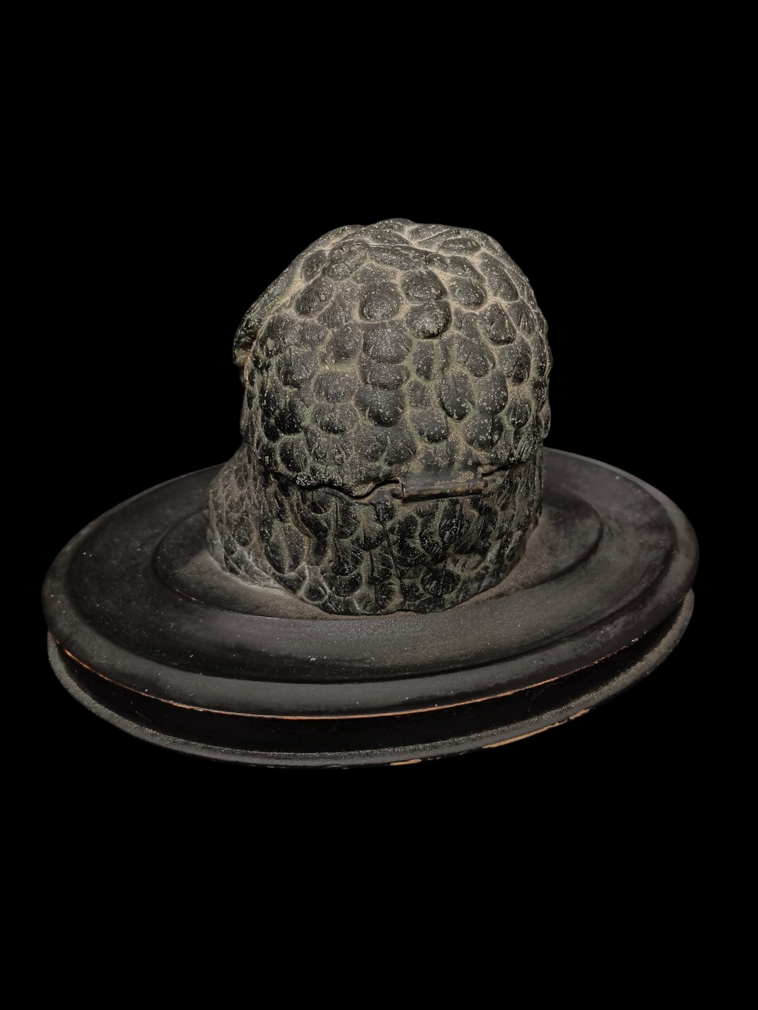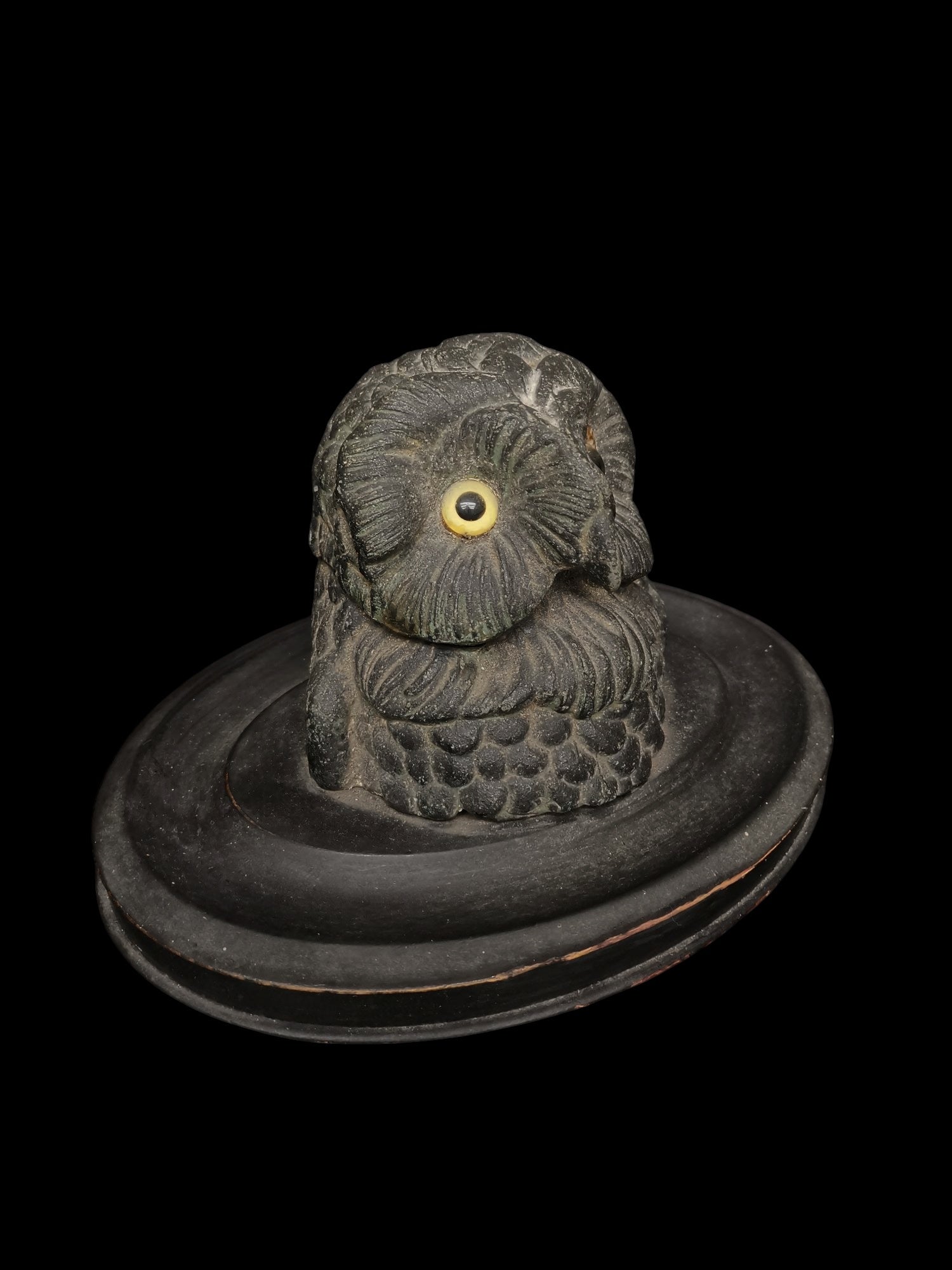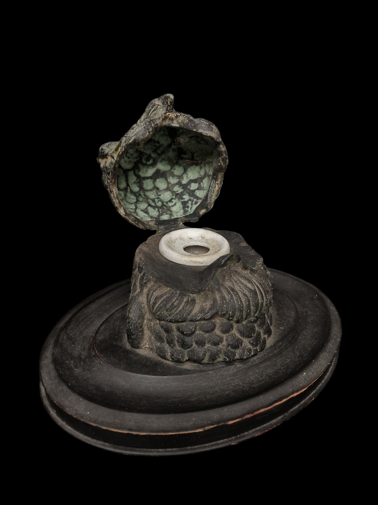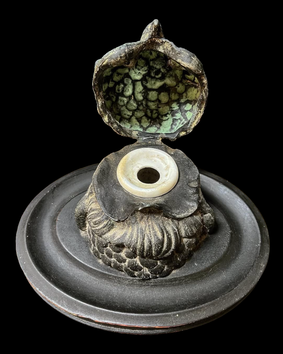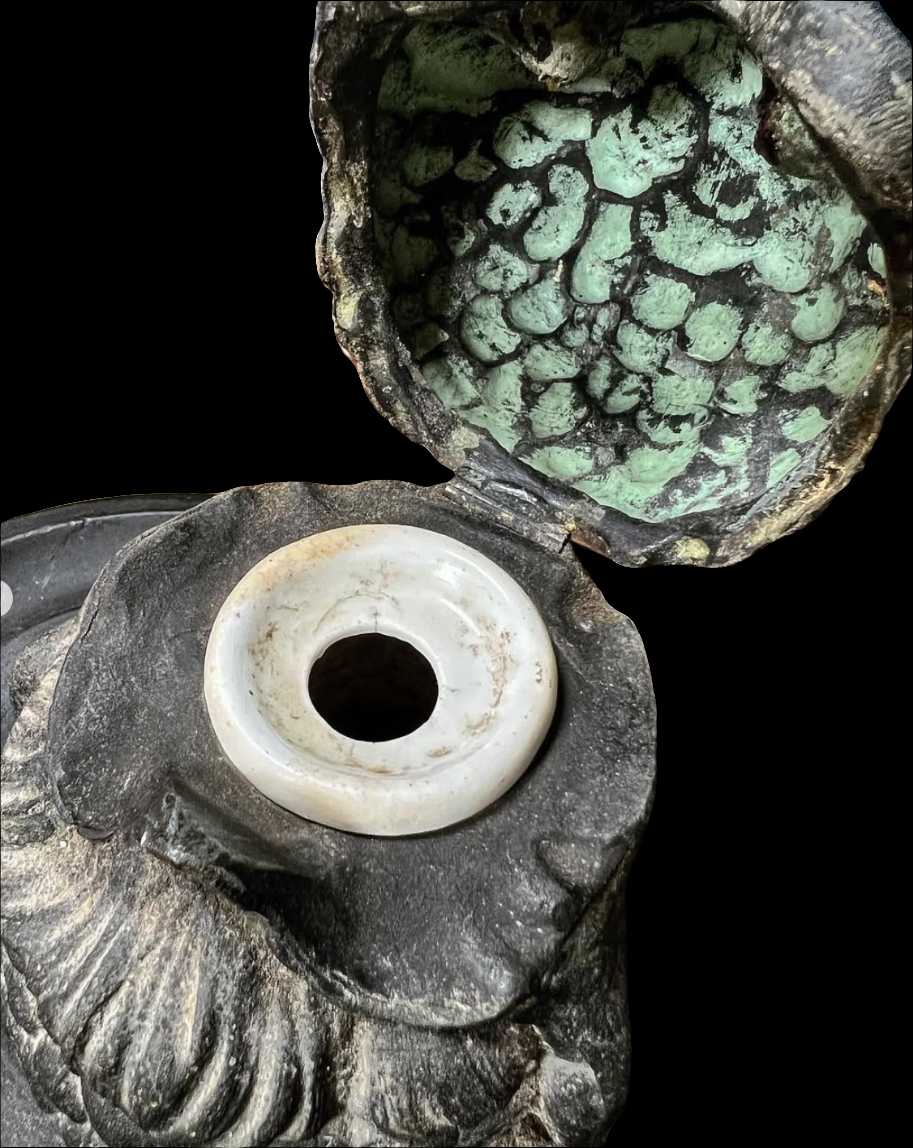The head lift to reveal the original ceramic Inkwell liner. The base is curved to hold pens and nibs.