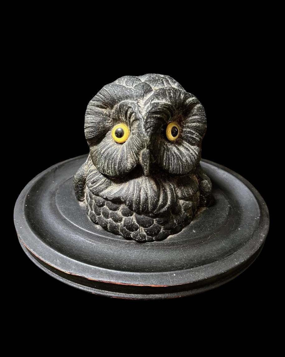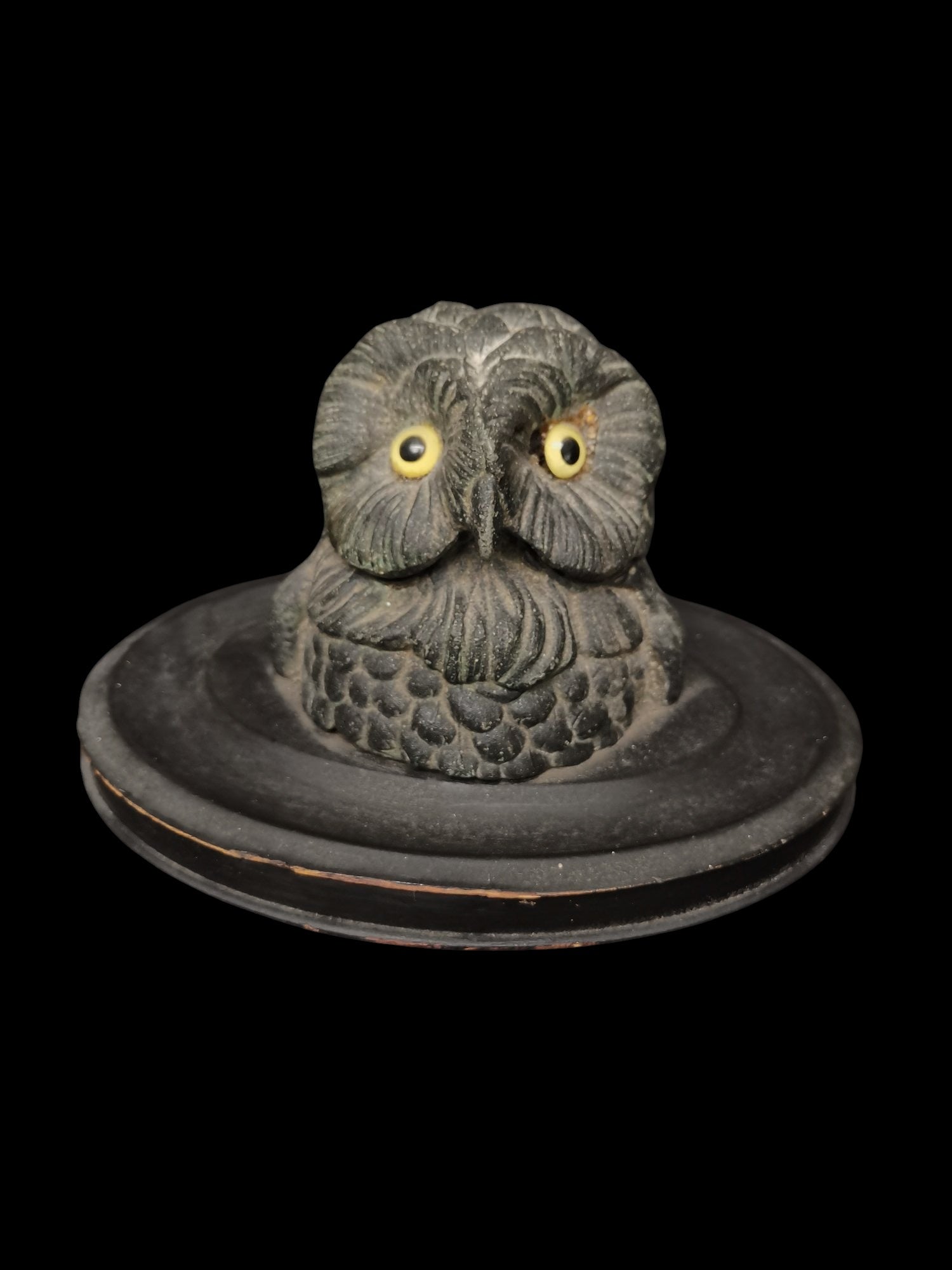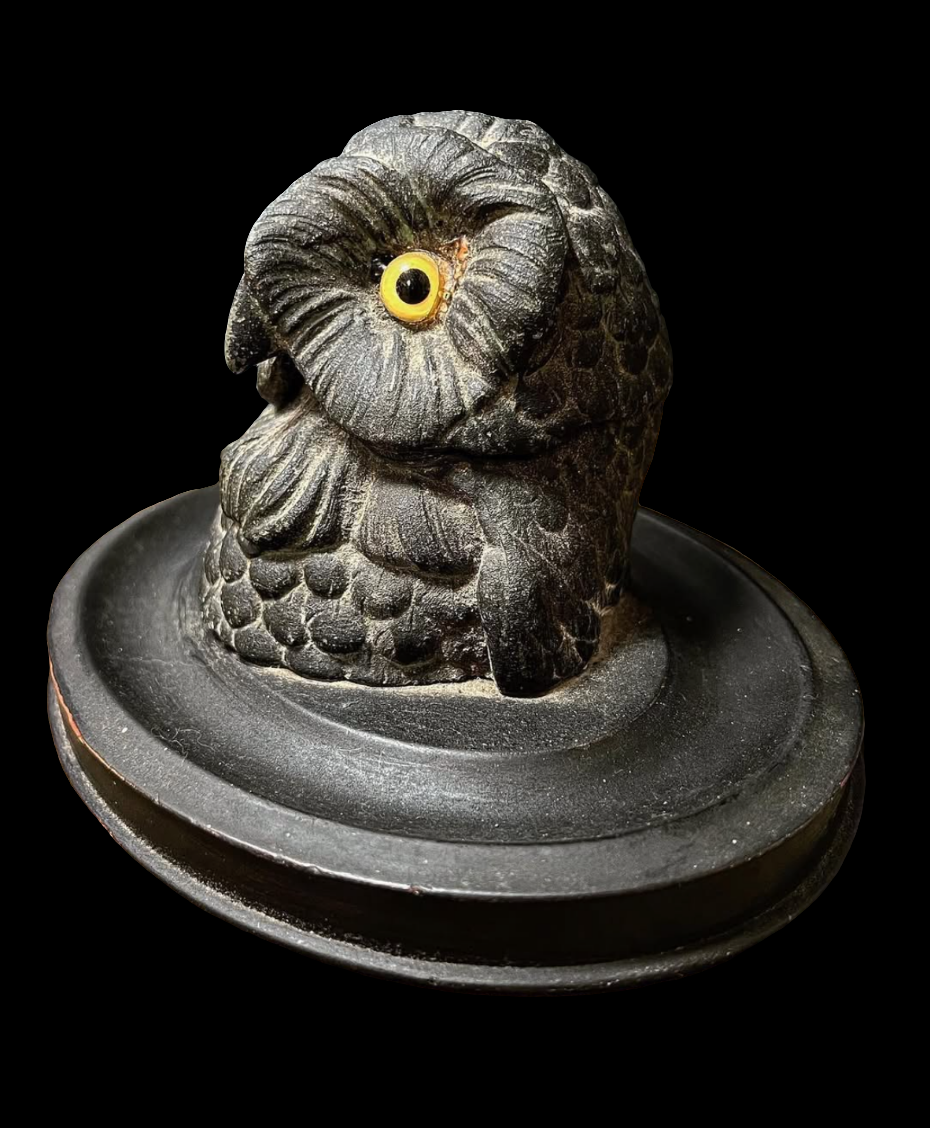 A delightful classic from the Victorian Era. Cast from pewter with an ebonised base and glass eyes.