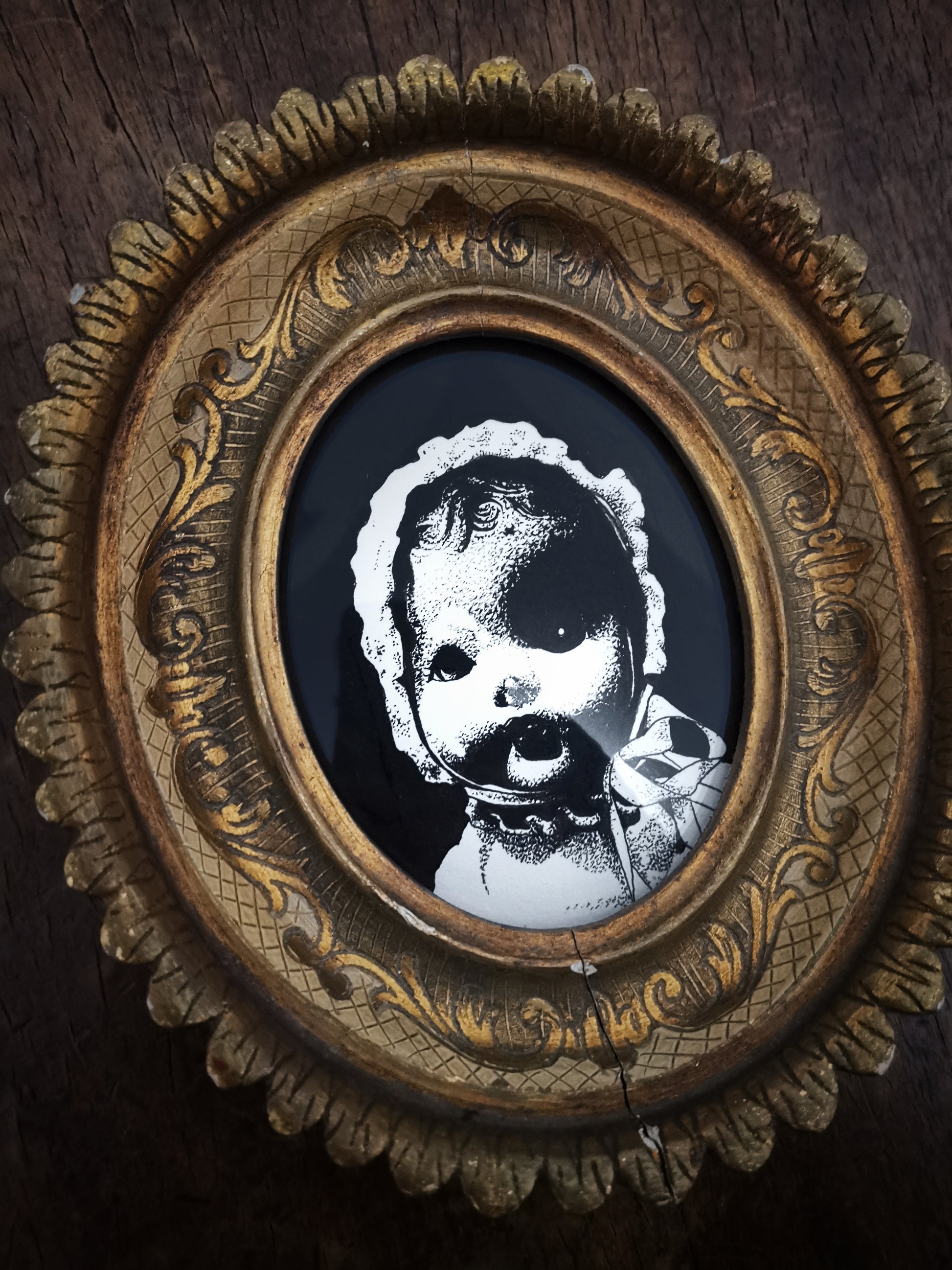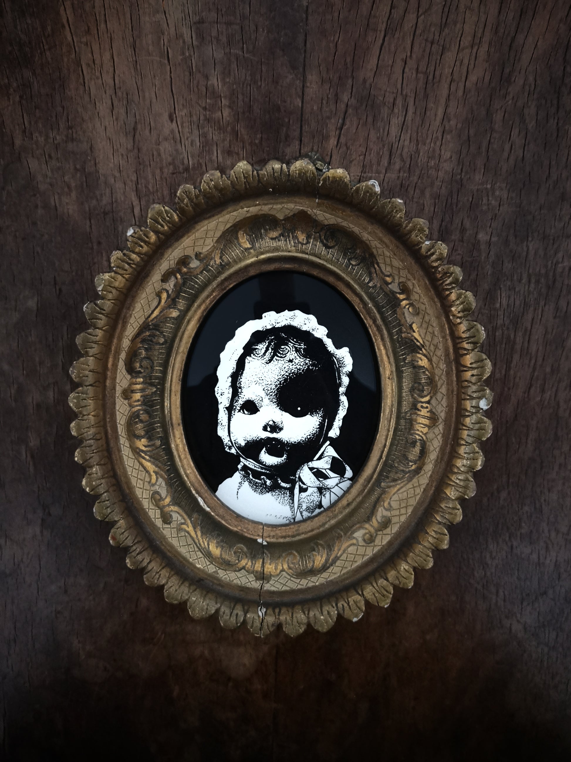 Housed in a beautiful mid century oval wooden gilt frame with original convex glass