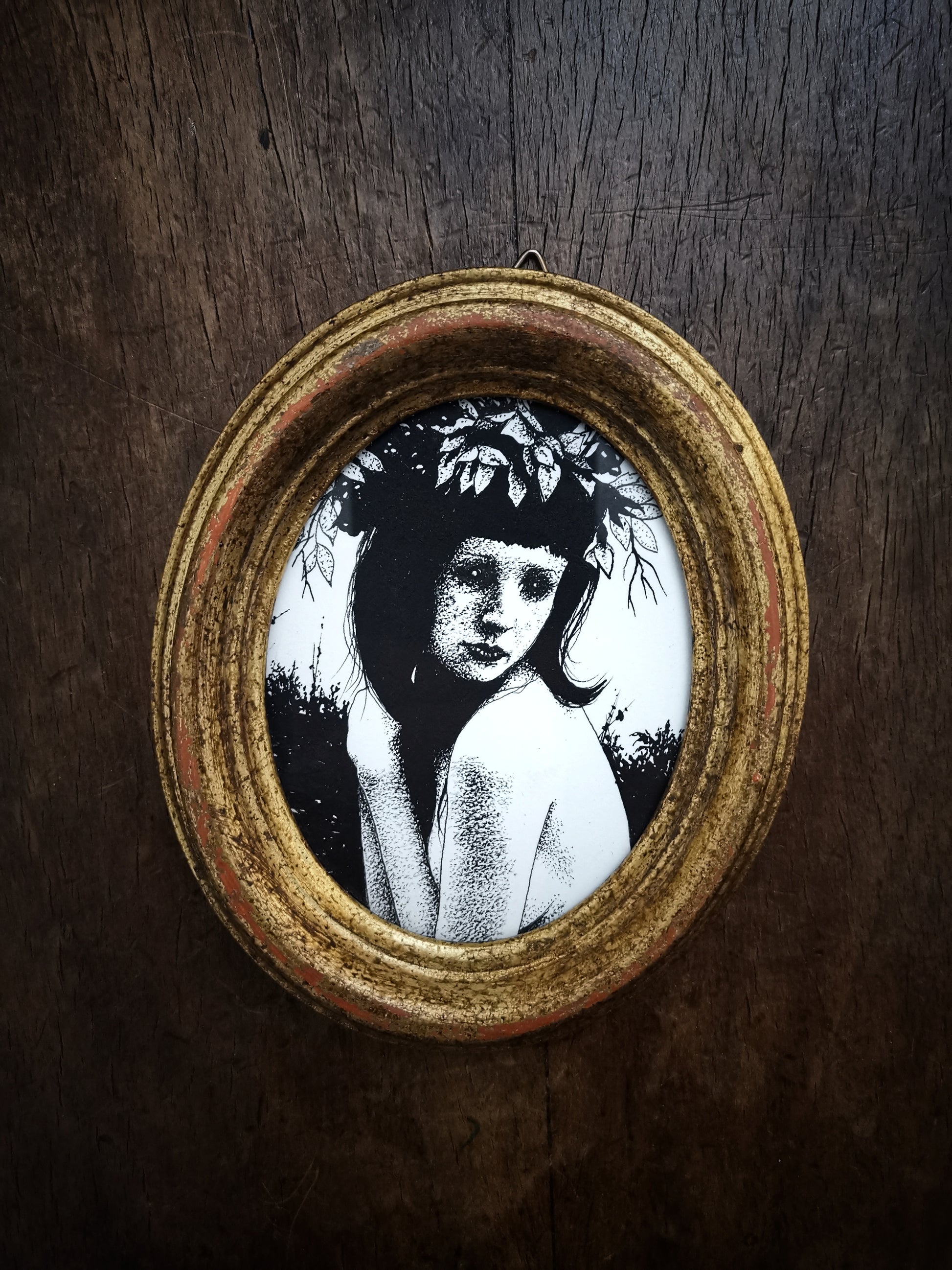 Housed in a beautiful Florentine wooden gilt oval frame