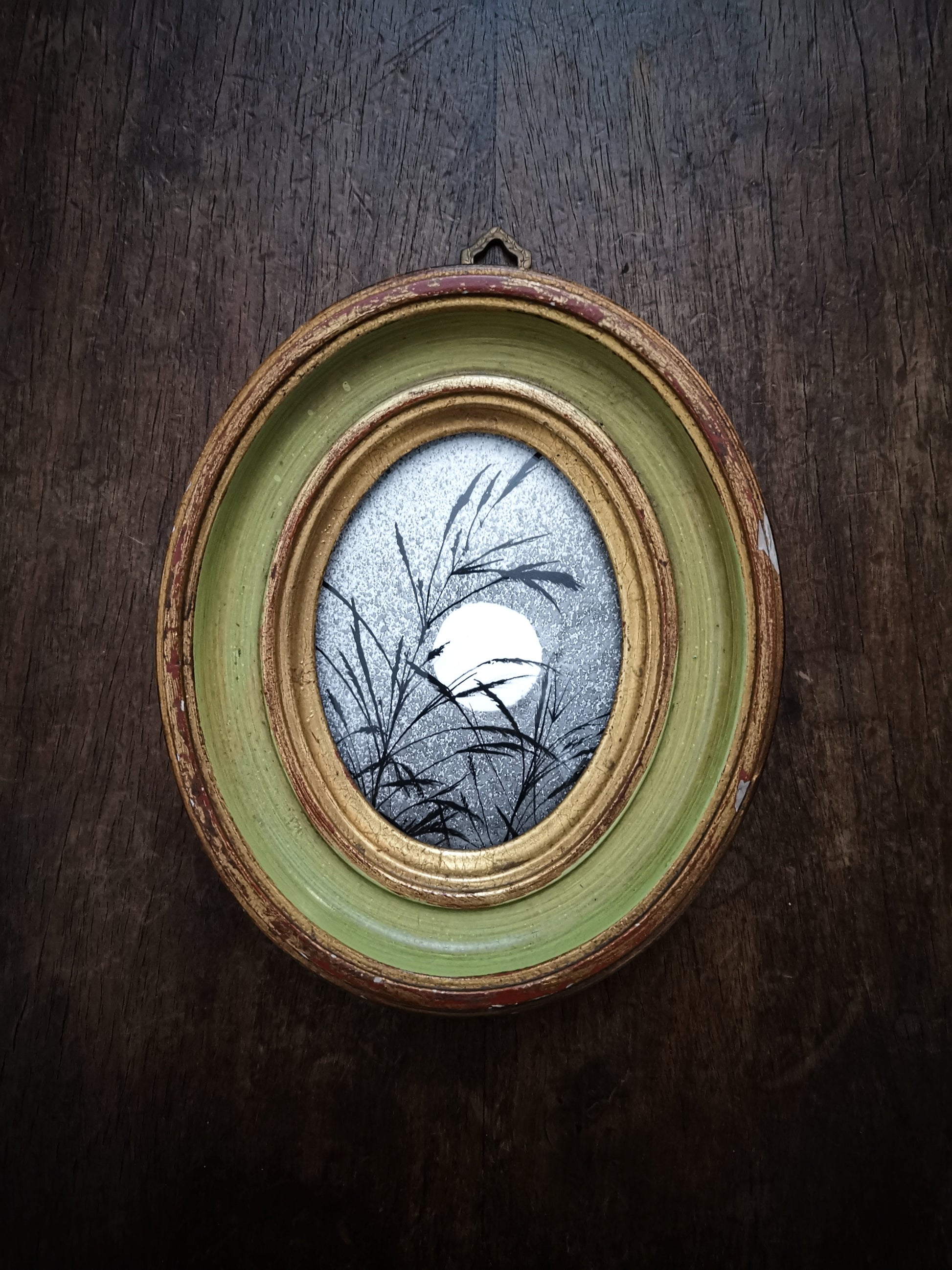 Housed in a beautiful Florentine wooden gilt/green enamel oval frame