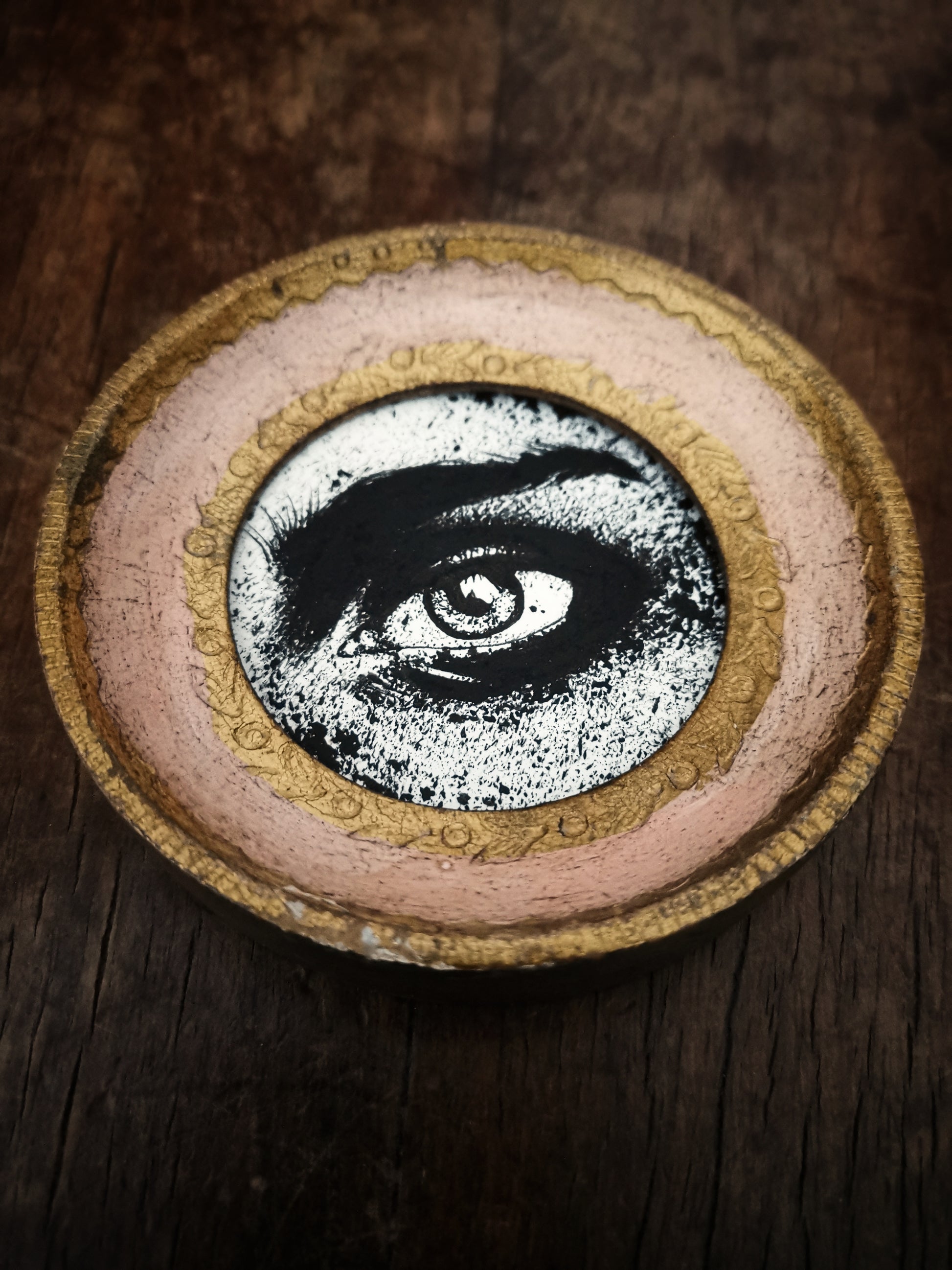 Housed in a lovely wooden gilt and pale pink enamel frame