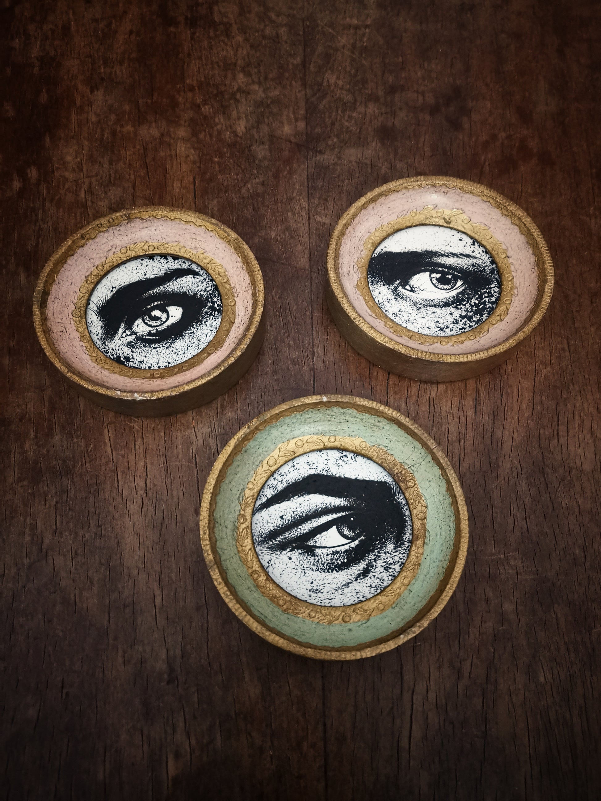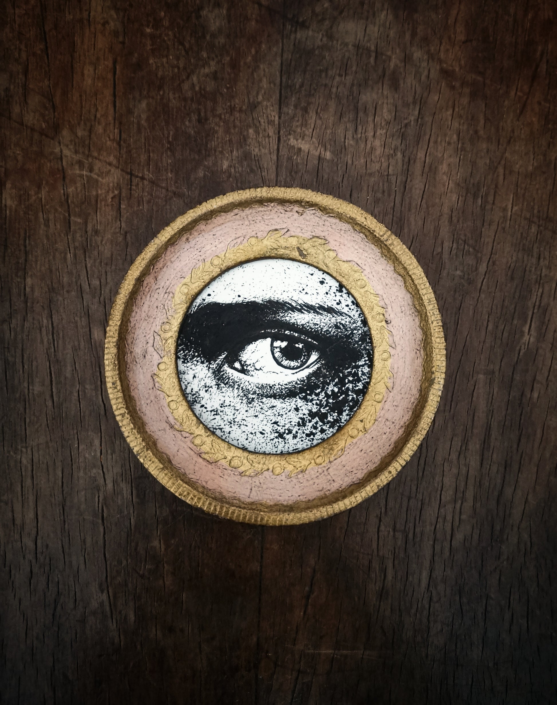 Housed in a lovely wooden gilt and pale pink enamel frame