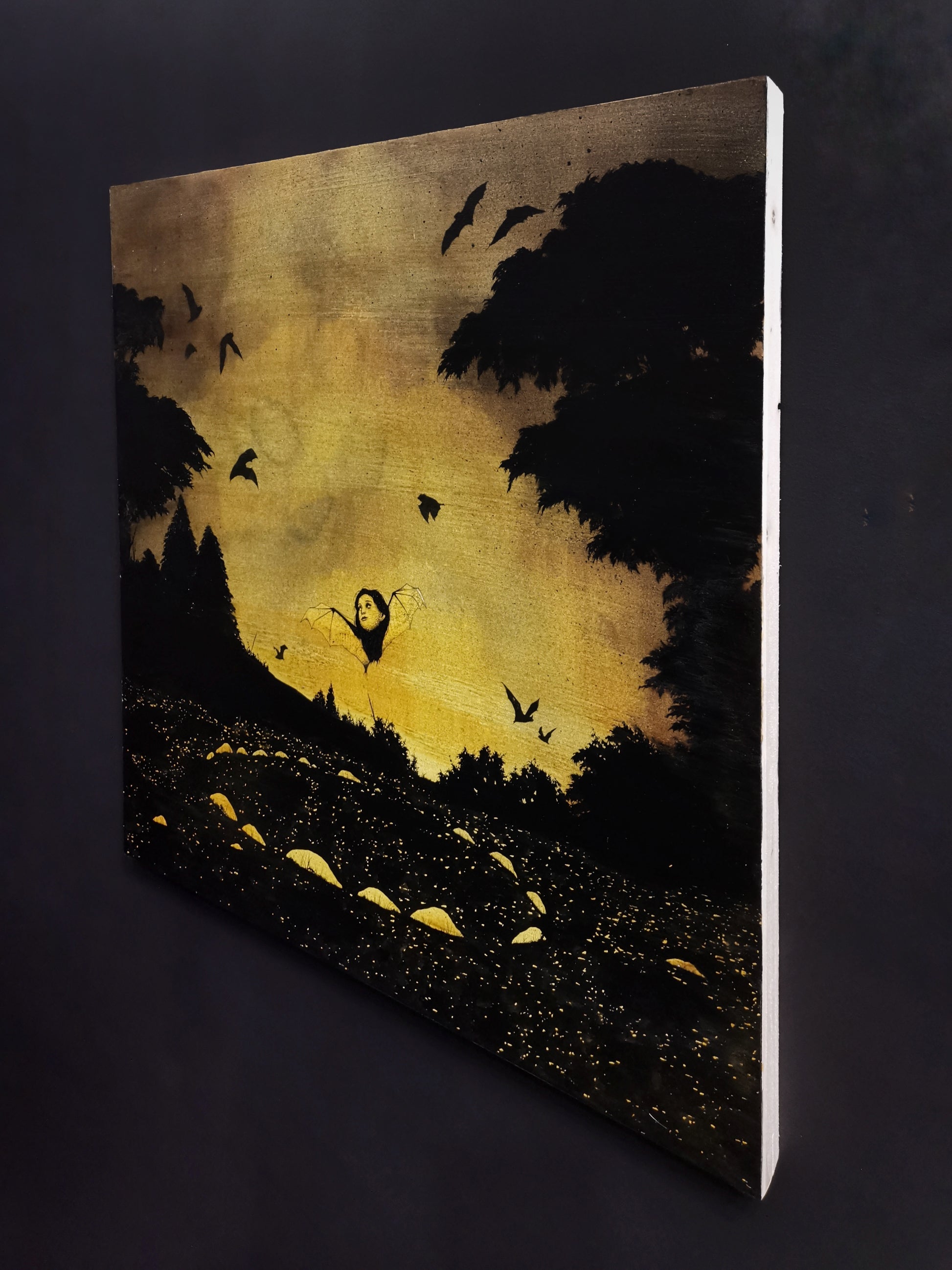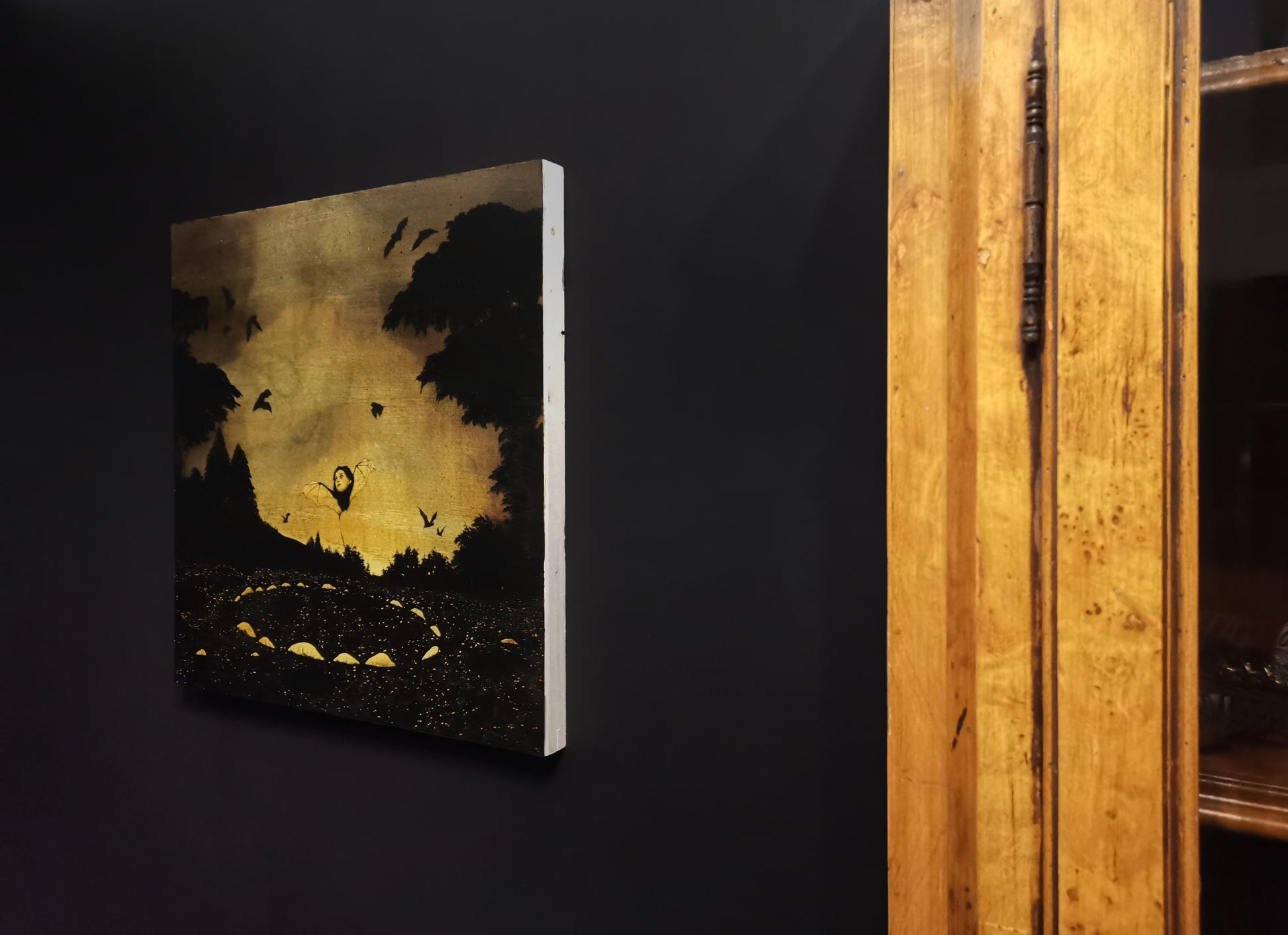 All the paintings of this series have a kind of "magical" strain in common. The amber patina on the surface will fade away during the years revealing (partially or completely) the original illustration.