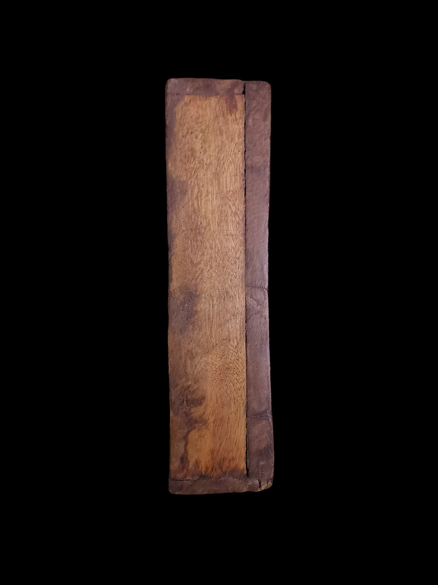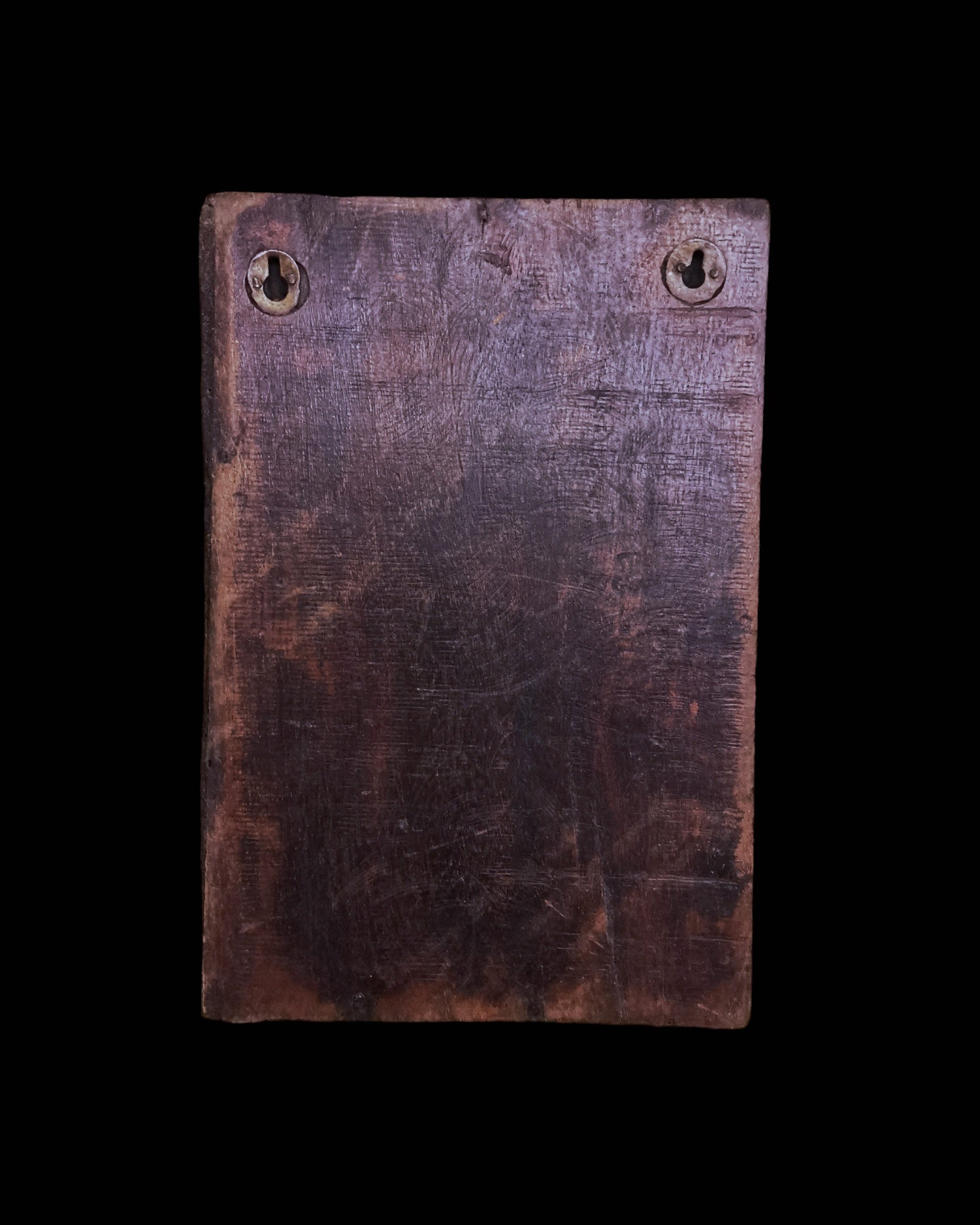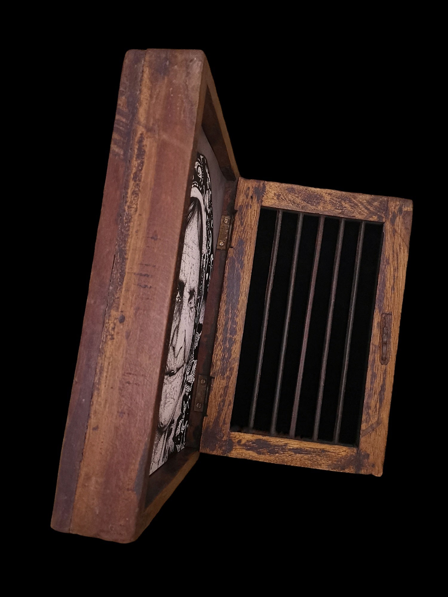 Housed in an exquisite XIX century hanging wall-mounted wooden box/key holder. Metal rods on the door. No glass. The original illustration inside is held by the door to avoid the use of glue or tape on the back of the paper, for that reason make sure to lay down the box before opening the door.