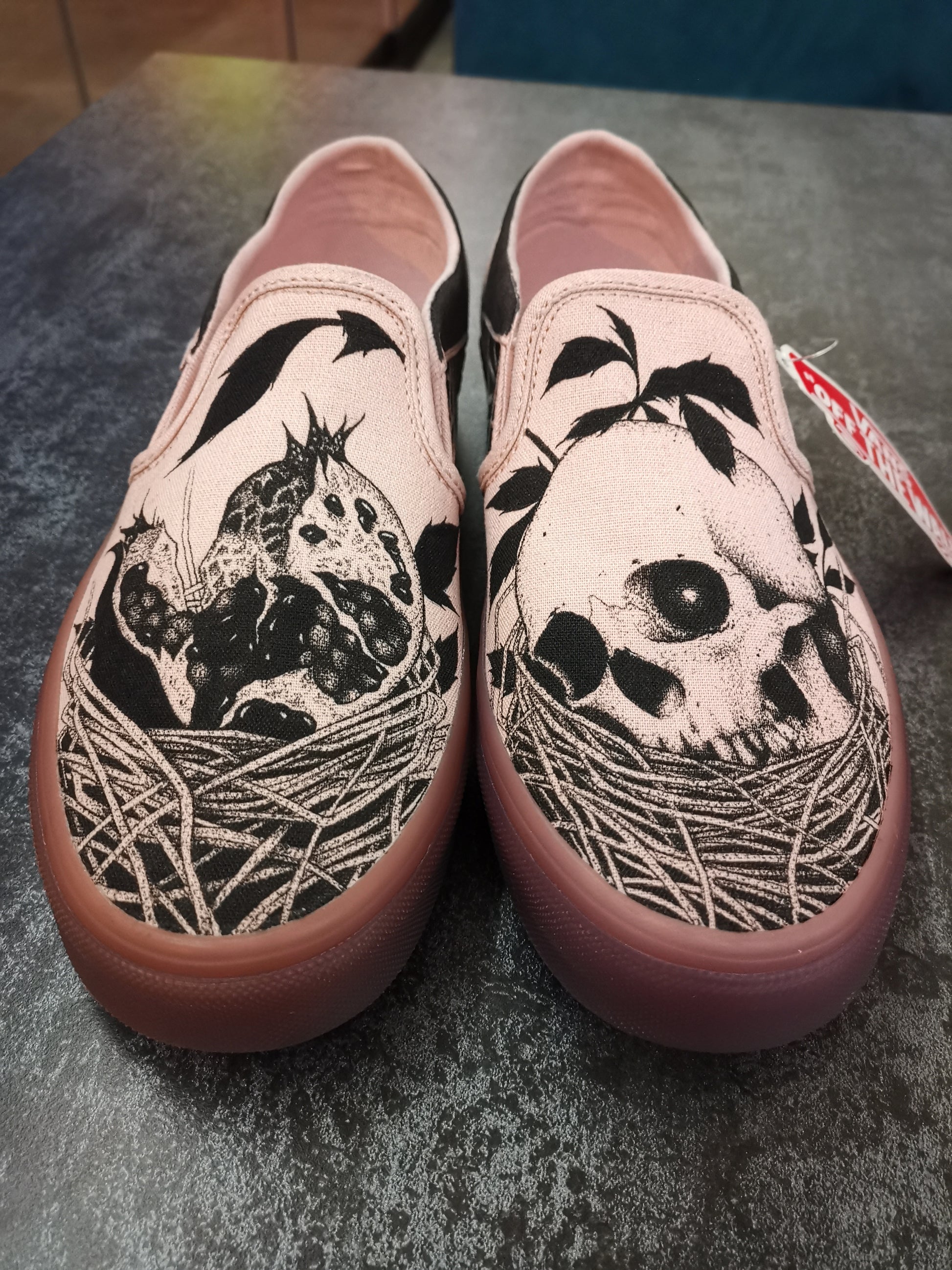 THIS PRODUCT HAS TO BE CONSIDERED AS AN ARTWORK. THE ILLUSTRATION HAS BEEN MADE WITH MICRO PIGMENT INK FOR WATERPROOF AND FADE PROOF FINE LINE WORK. ALSO SEALED ONCE COMPLETELY DRY. FOR THAT REASON THEY ARE TECHNICALLY FULLY WEARABLE BUT WE DECLINE ANY RESPONSIBILITY IN CASE OF DAMAGES DURING THEIR USE OR WASHING.